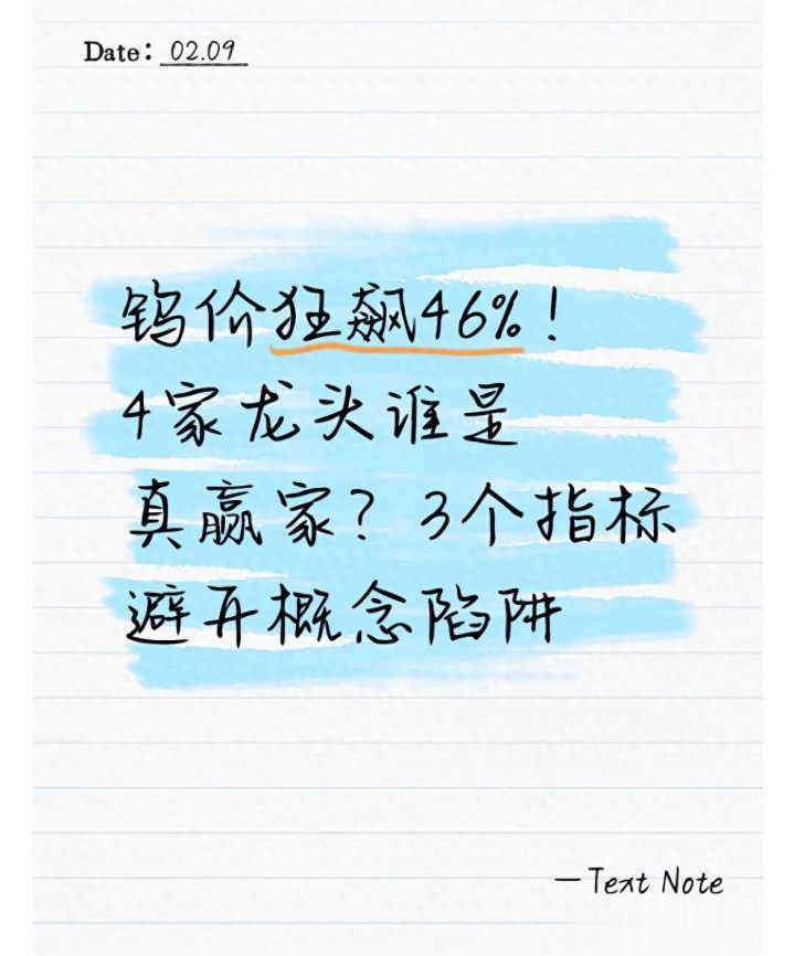 这篇著作就用2026年最新的政策、产能、财务数据,拆解4家核心龙头的真实实力,从“资源储备、时代壁垒、事迹弹性”三个维度分清真假赢家,还给出3个平凡东谈主能平直用的筛选步调,帮你识破钨价飞腾的核心逻辑,不被名义热度带偏。通盘信息均来自泰斗信源,真实可核,拒却污秽表述。